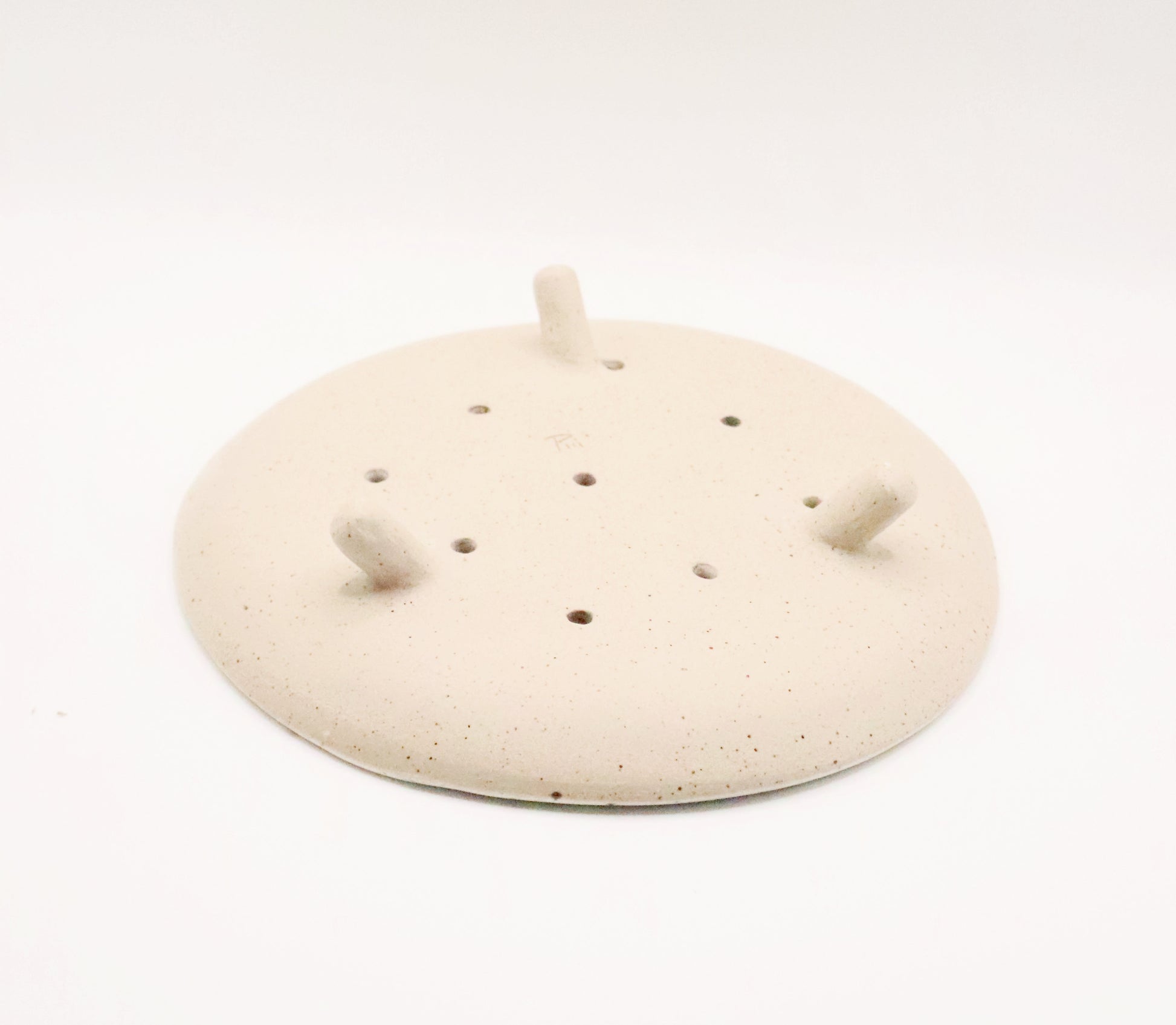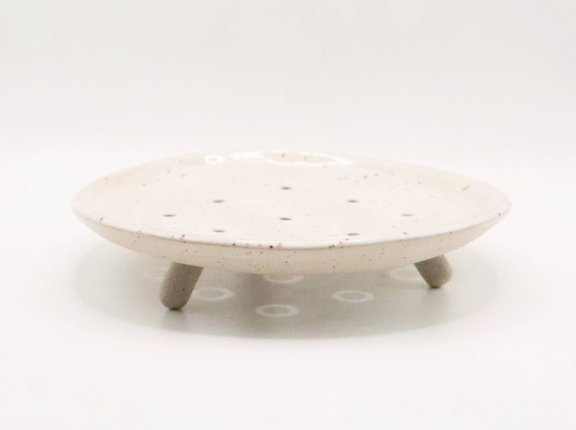 L'assiette possède plusieurs petits trous pour permettre aux fruits de respirer. Elle a également trois petits pieds en grès bruts.