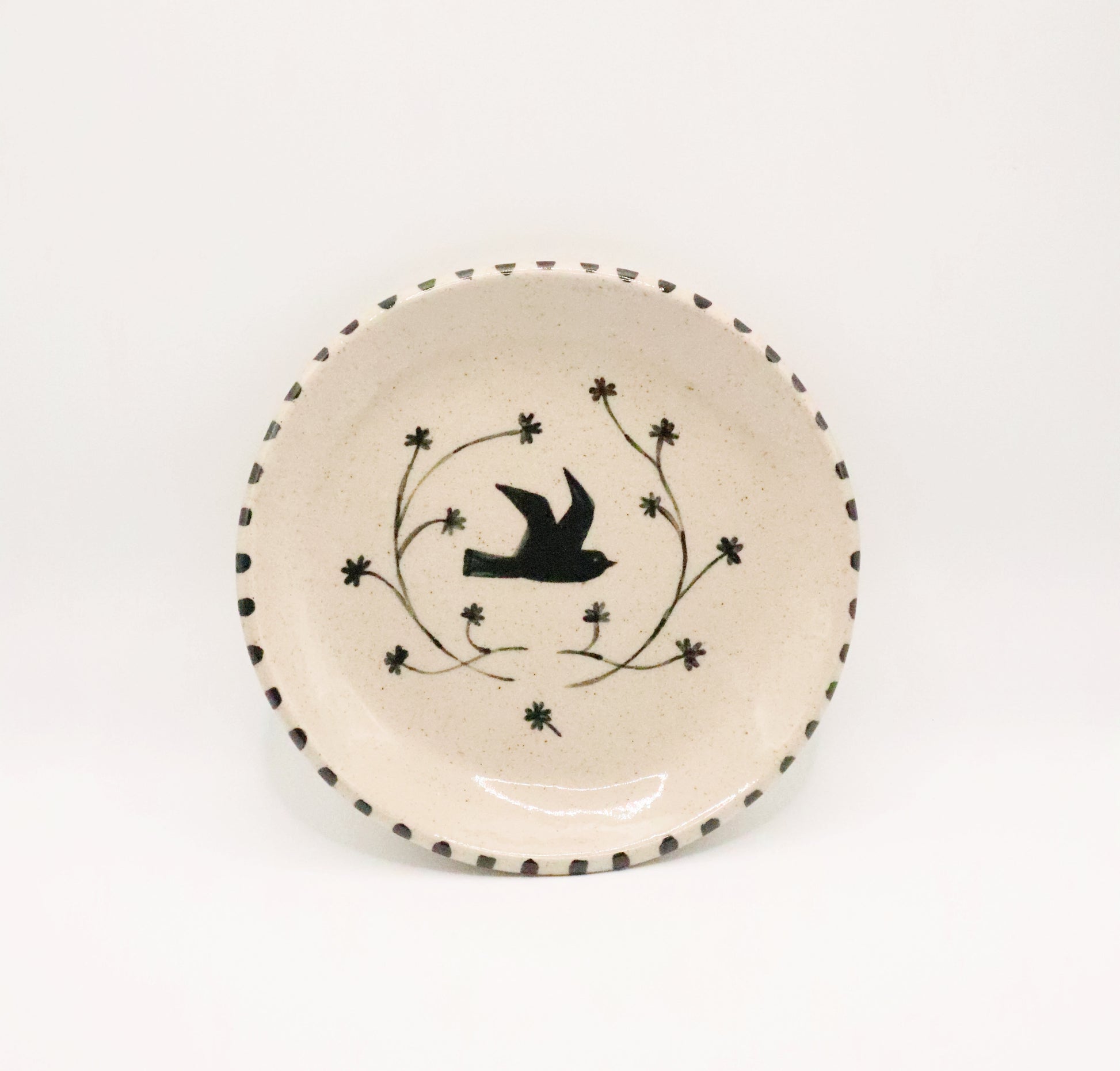 L'assiette est décorée à l'engobe noire et émaillée transparent sur le dessus, ce qui lui donne de la brillance.