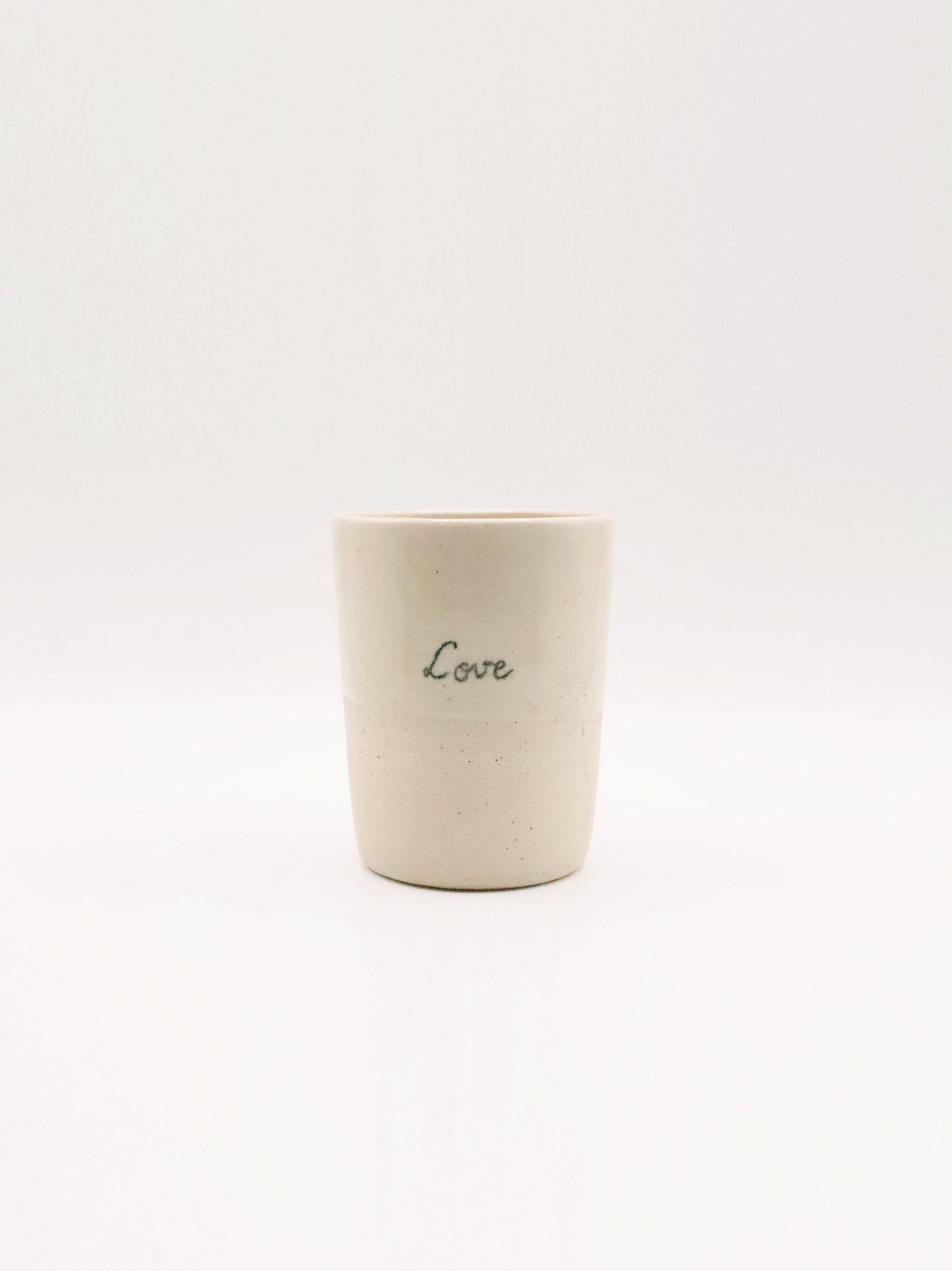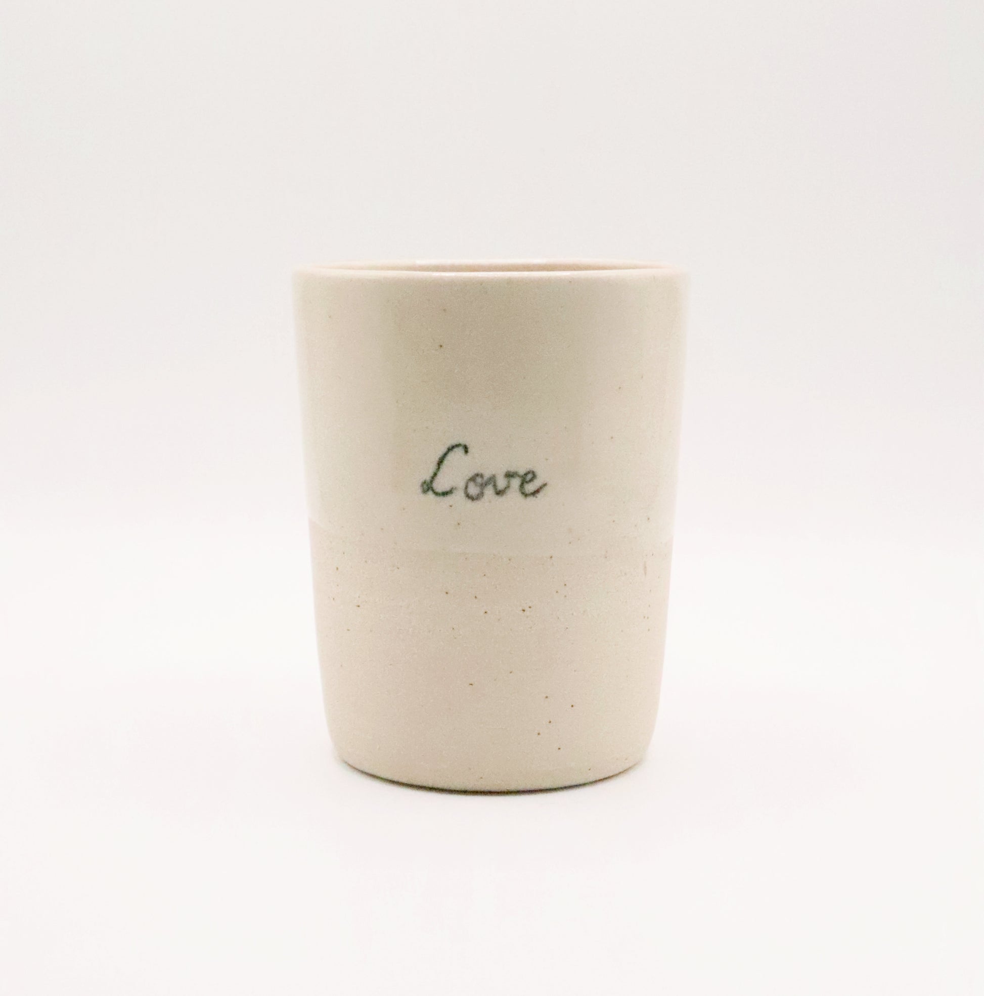 Extérieur : décoré au crayon d'oxyde avec le mot Love, et émaillé transparent sur les 2/3 de hauteur, ce qui fournit un touché doux à la main et sur les lèvres.