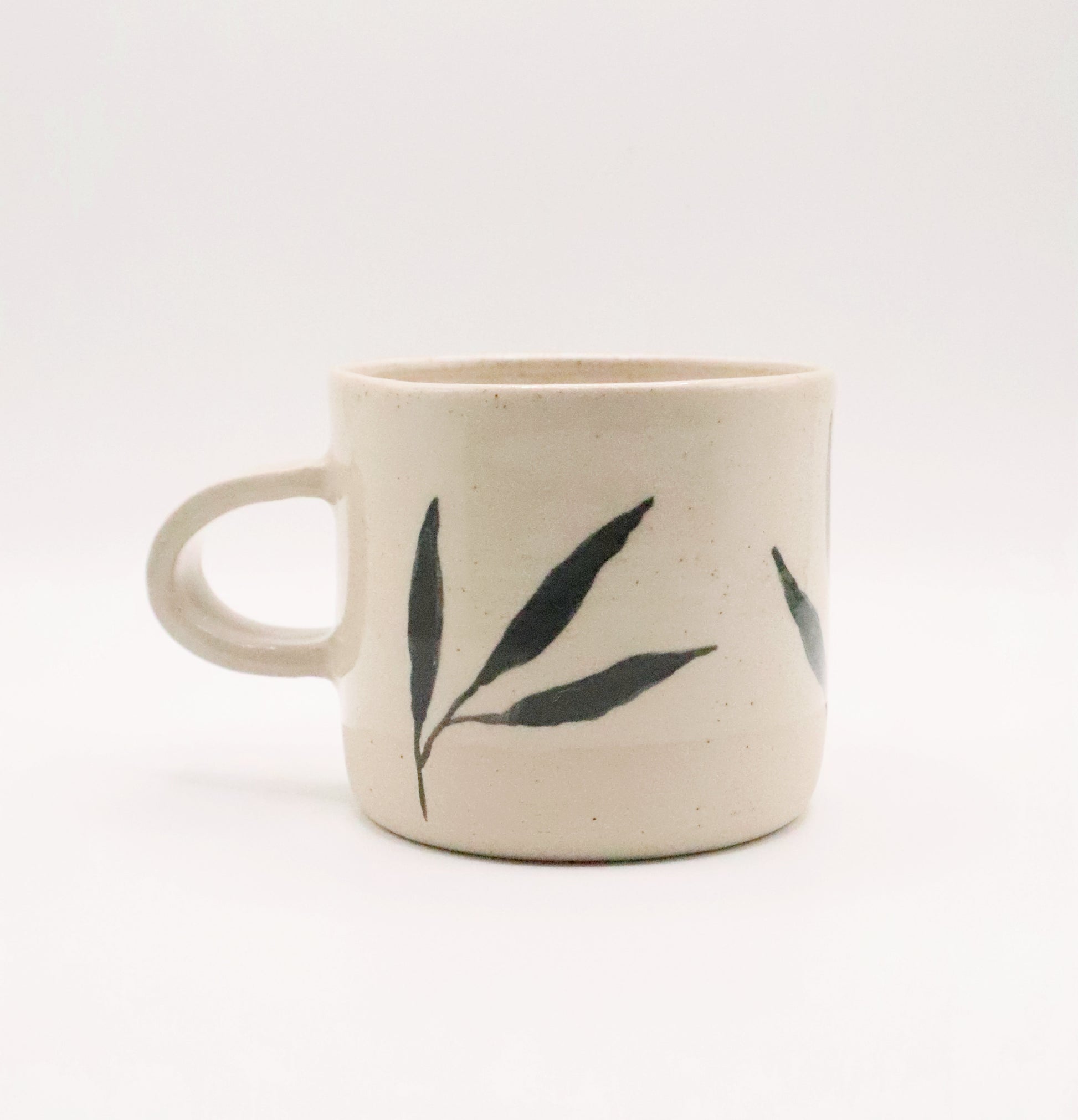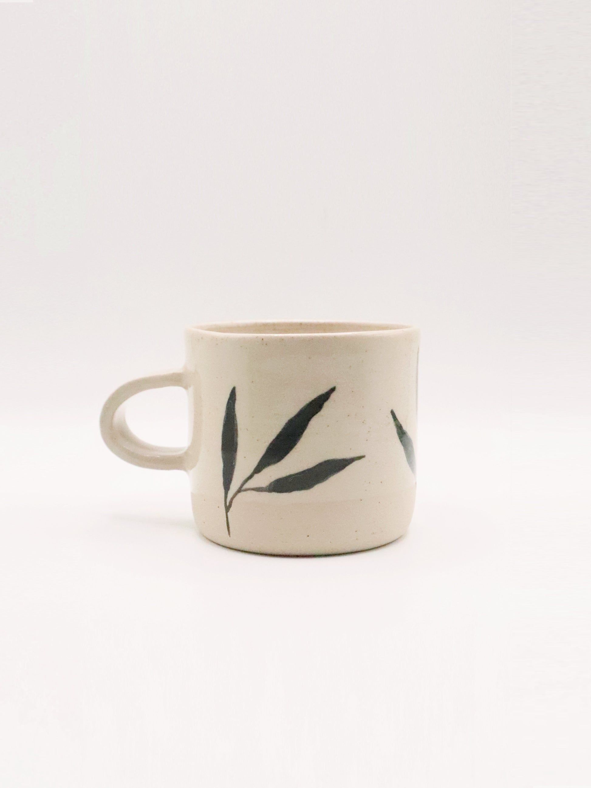 Mug en grès pyrité, décoré à l'engobe et émaillé avec une couverte transparente.