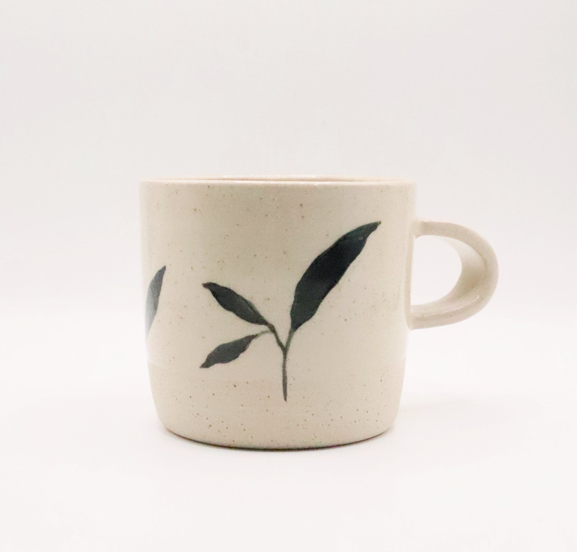 Mug en grès pyrité, décoré à l'engobe et émaillé avec une couverte transparente.