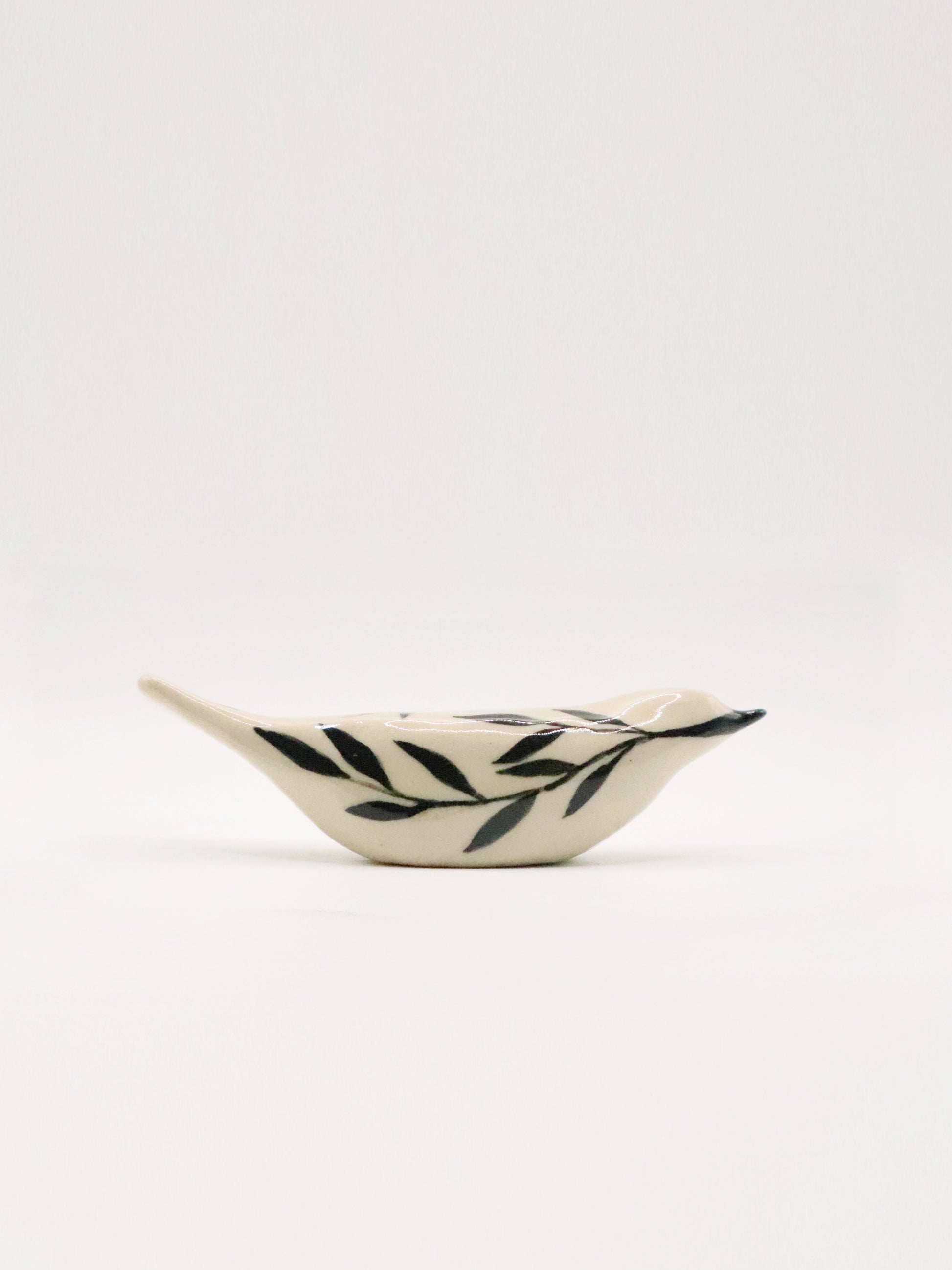 L'oiseau est décorée à l'engobe noire et émaillée transparent sur le dessus, ce qui lui donne de la brillance.