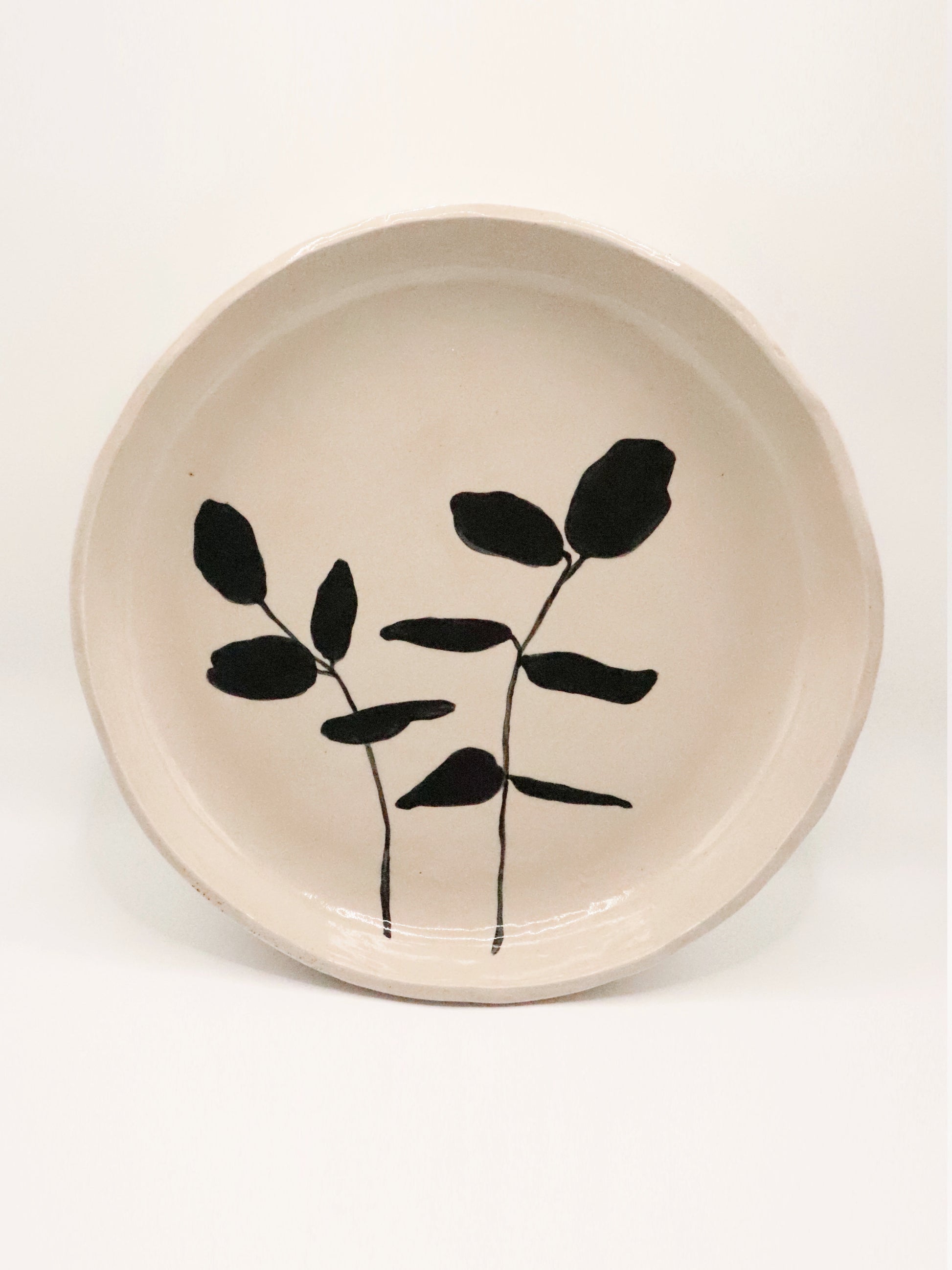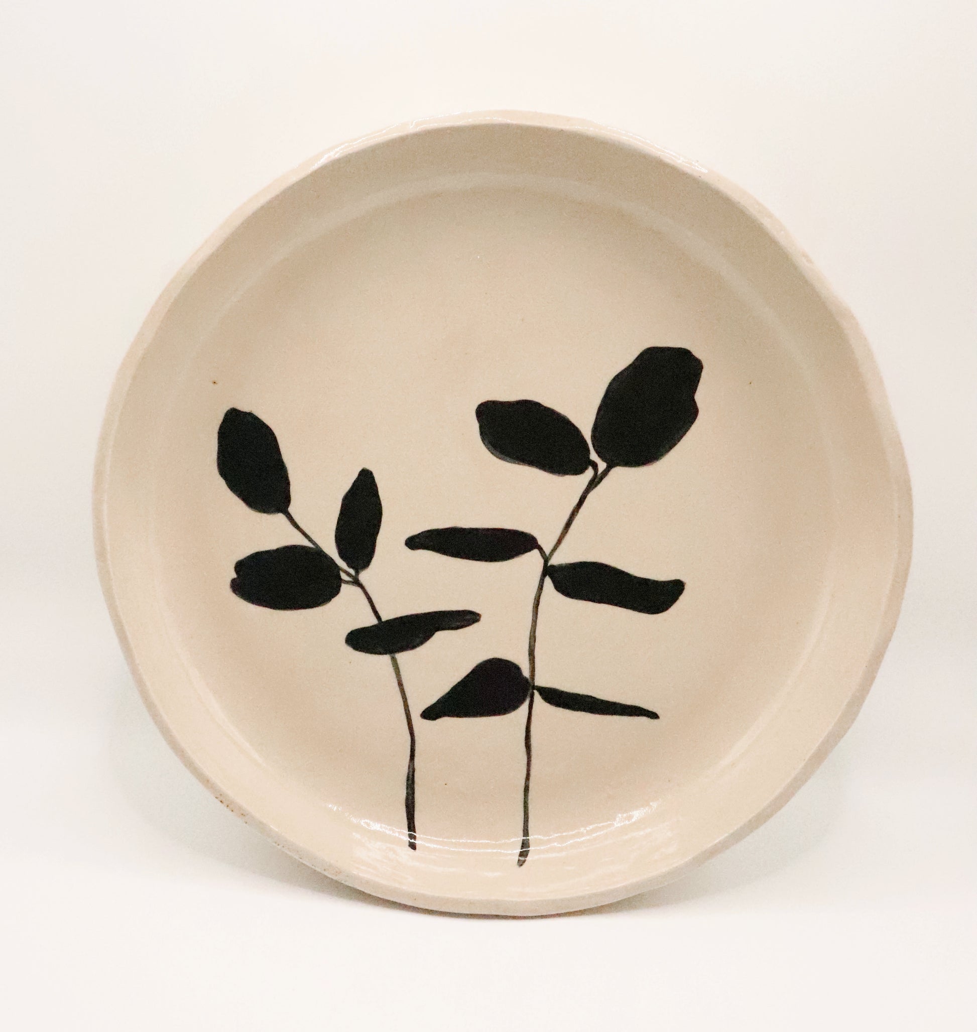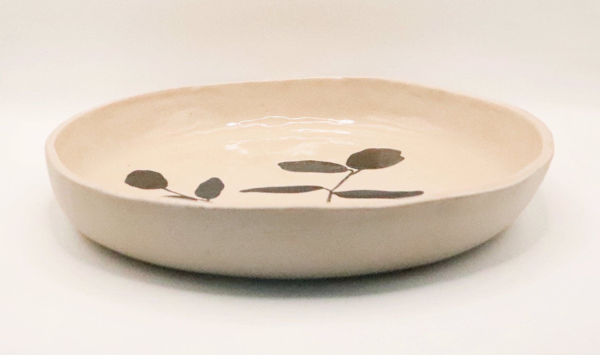 Le plat est décoré à l'engobe et émaillée transparent sur le dessus, ce qui lui donne de la brillance.