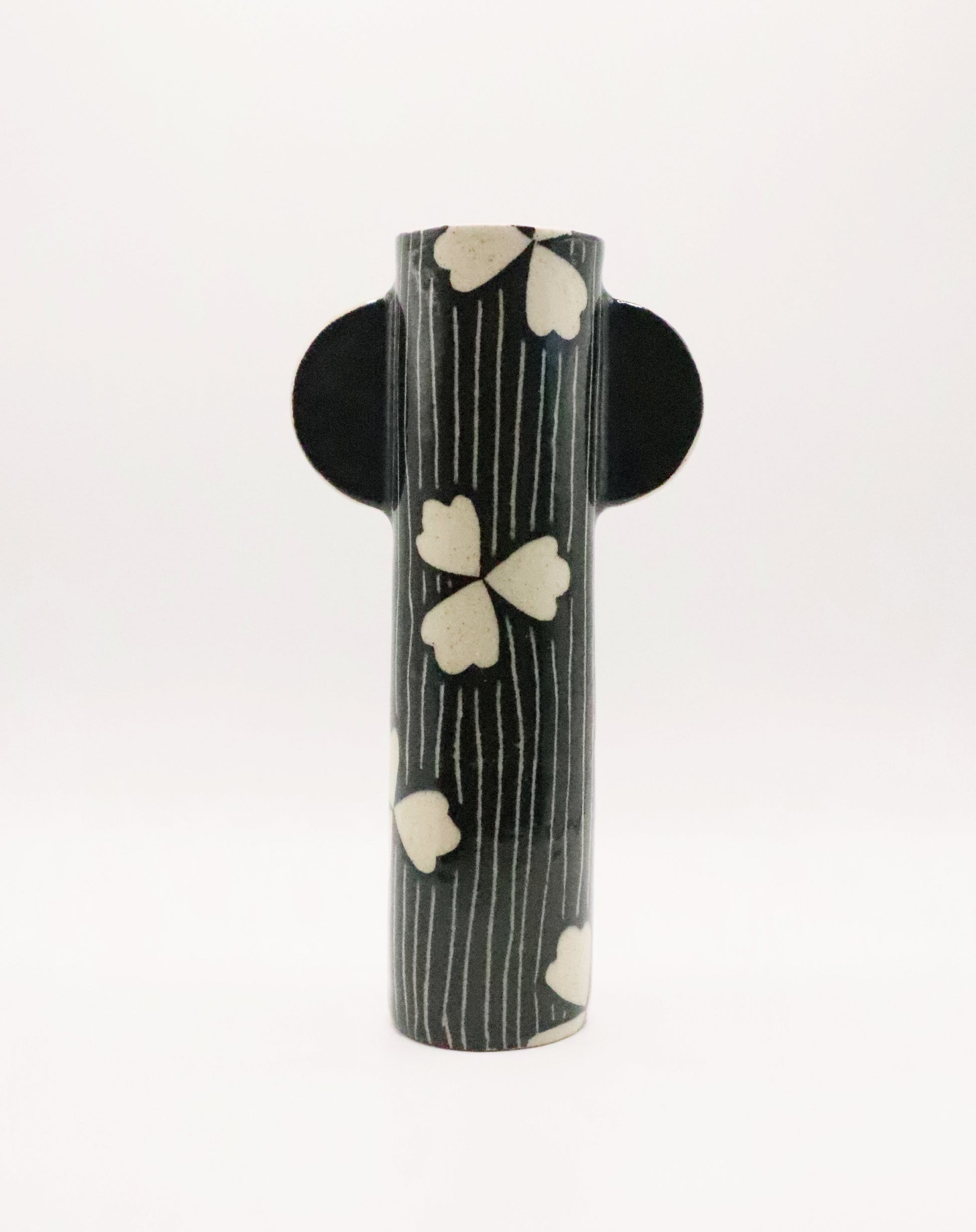 Extérieur : décor à l'engobe noir, émaillé transparent sur toute sa hauteur, ce qui lui donne de la brillance.